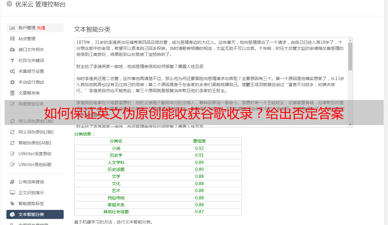 优采云 发布时间: 2023-02-18 17:36英文伪原创是指用已有的文档或者句子,经过算法处理后,重新排列组合形成新的文章。这种方式减少了大量的写作时间,但也有一定的风险。那么英文伪原创能否被谷歌收录呢?