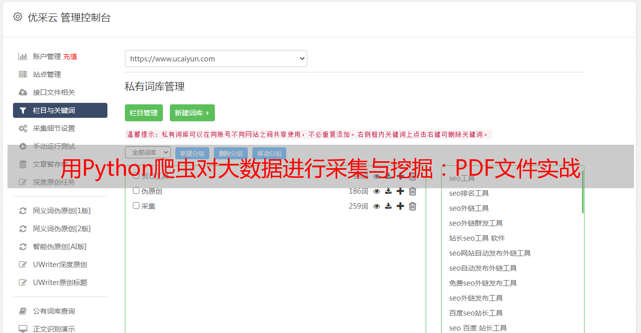 首先,Python爬虫可以帮助企业快速地从网上采集PDF文件。它能够从各种信息源中,如新闻、论坛、博客等,采集出有用的PDF文件。此外,Python爬虫还能够从各行各业的企业官网中采集有用的PDF文件,例如优采云(www.ucaiyun.com)的SEO优化服务相关文件。