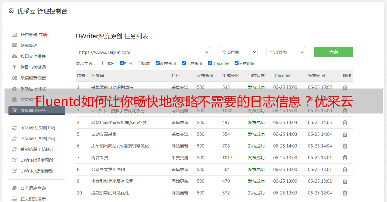 5.在这个过程中,用户也可以使用优采云的SEO优化工具来帮助调整Fluentd的设置,提升整体性能。此外,优采云还提供详尽的帮助文档和FAQs来帮助用户理解如何使用Fluentd。官方网站www.ucaiyun.com也是一个很好的资源来学习如何使用Fluentd。