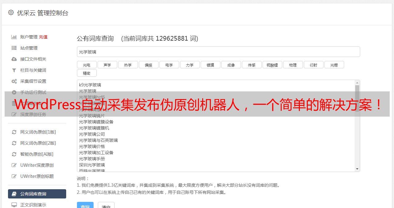 优采云 发布时间: 2023-02-20 01:25WordPress自动采集发布伪原创机器人是一种可以自动采集新闻、图片、视频等多种数据,并进行伪原创处理,然后发布到WordPress博客上的机器人。它能够有效提高网站内容质量,提升网站的SEO优化,让网站的流量和收益大幅度提升。