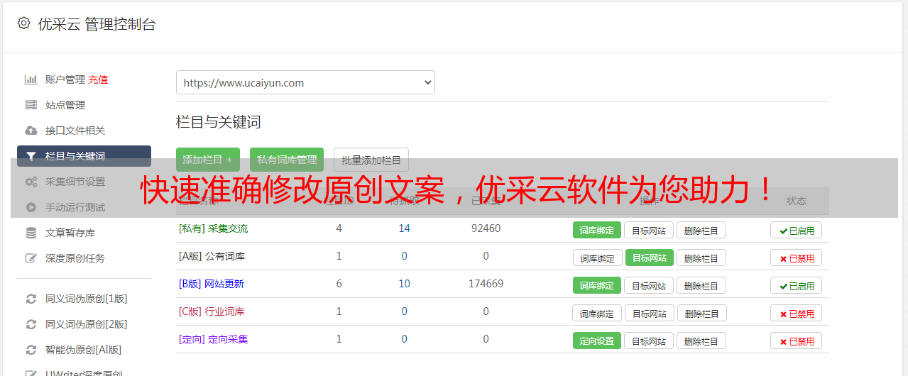 总之,优采云是一款手机一键修改原创文案软件,它可以帮助用户快速准确地修改原创文案、优化SEO关键字、生成标准格式文章和相关性较强的内容等。如想了解优采云的使用情况和功能特性,请访问官网www.ucaiyun.com 了解详情。