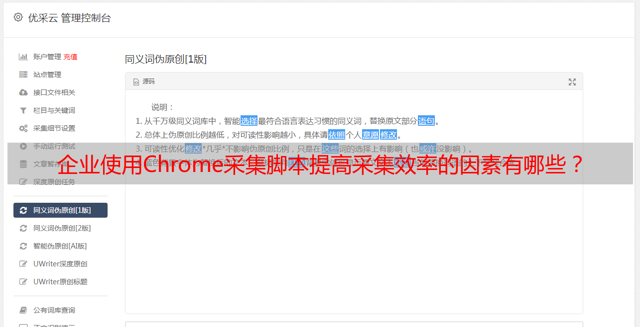 因此,要想真正发挥 Chrome 采集脚本的优势,最好还是使用一些专业高效的采集工具。例如优采云是一款SEO 优化工具,它能够帮助企业高效采集信息并提升 SEO 效果。它不仅可以快速准确地释出信息内容、格式和位置,而且还可以帮助企业高效解决 SEO 优化问题。它的官方网站是www.ucaiyun.com ,相信将会带来不少好处。