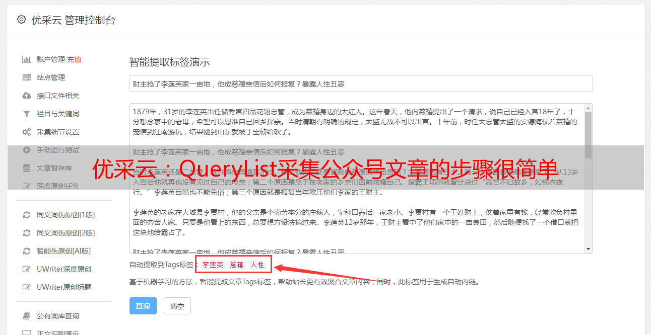 总之,QueryList是一个强大而且好用的爬虫工具,能够帮助我们快速地从公众号文章中采集信息。而如果想要进一步地对文章内容进行SEO优化和上传到各大平台去,那么就需要使用”优采云”这样一个强大而且好用的SEO工具了,它是一个功能强大而且易用的SEO工具,能够帮助我们快速地将文章内容上传到各大平台去,进而得到最大化地影响力,如想要详细了解,敬请访问”www.ucaiyun.com”.