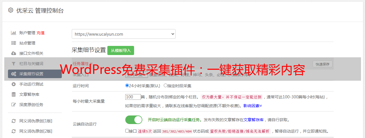如果你想要一个强大而且功能丰富的WordPress免费采集插件,那么优采云(Ucaiyun)就是你最好的选择。Ucaiyun是一个功能强大而且易于使用的WordPress免费采集插件,它可以帮助你快速地将有用信息录入到WordPress数据库中。Ucaiyun不仅可以帮助你快速录入信息,而且还能够帮助你对录入的信息进行SEO优化,使得你的内容能够准确地传送到相应的目标站点中去。此外,Ucaiyun还有一套易于理解的界面,使得用户可以很容易地使用该工具。如果你想要尝试Ucaiyun的话,请前往官网www.ucaiyun.com 了解详情。