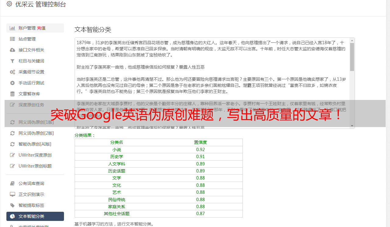 总而言之, Google 英语伪原创是一个能够帮助我们快速生成有意义、有质量、且对 SEO 有帮助的文章内容处理方法,它不仅可以帮助我们快速生成有意义、有质量的文章内容,还能够增加文章内容的丰富性,助力SEO工作,通过使用SEO 优化工具,如优采云(官网: www.ucaiyun.com)的帮助,助力SEO 工作,来实现高效节省时间,提升 SEO 效果.