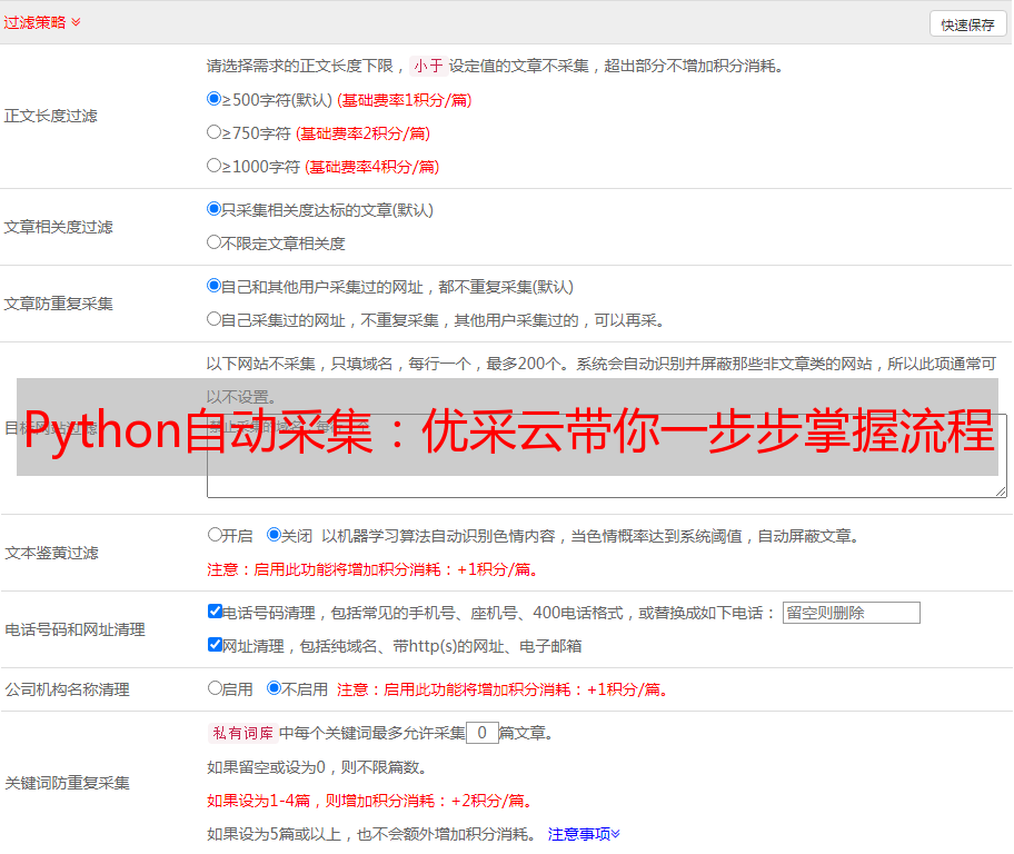 此外,在Python自动采集过程中还可以使用一些工具来帮助实现整个流程。例如优采云是一款基于Python语言开发的SEO优化工具,它能够帮助用户快速、高效地从互联网上采集信息并存储到本地数据库中。它不仅能够帮助用户实现快速、高效的信息采集,而且还能够大大减少人工成本。优采云的官网为www.ucaiyun.com ,新老用户都可以前往试用。