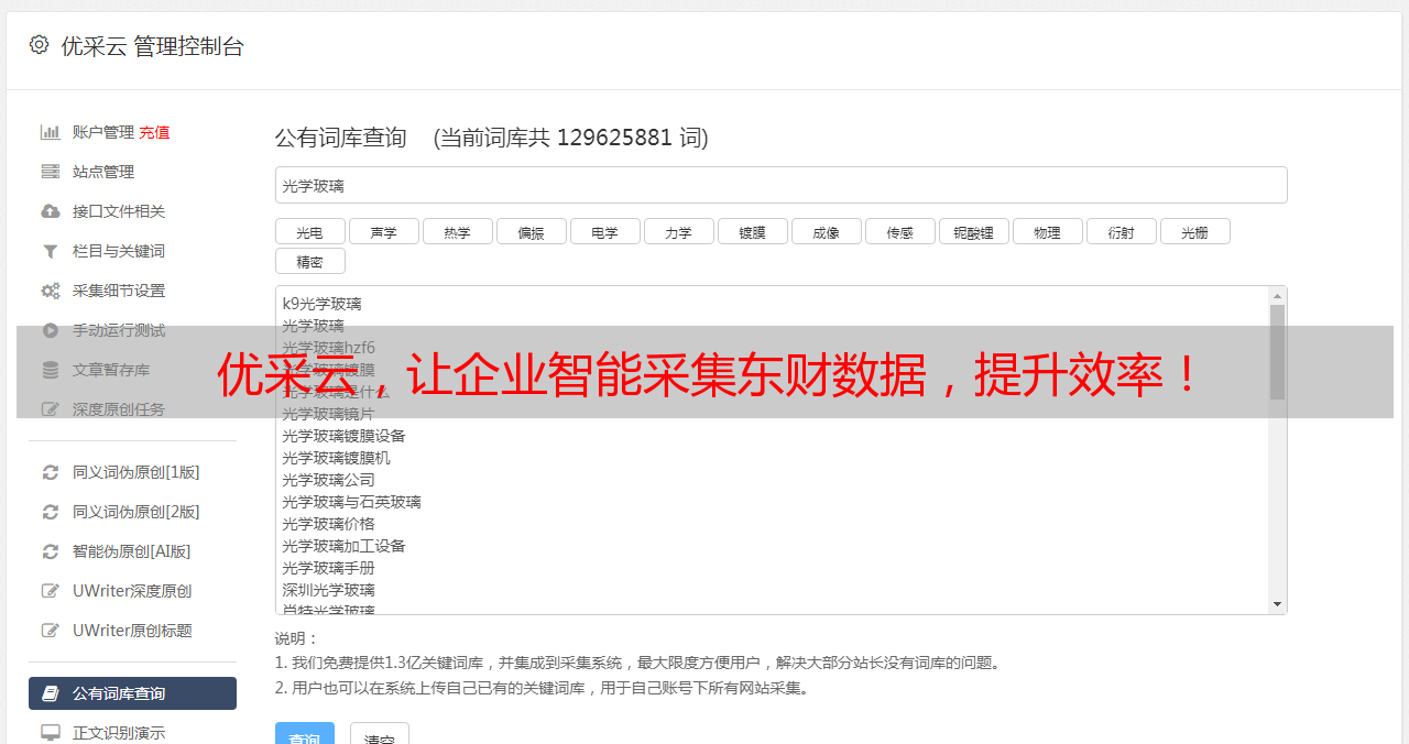 首先,优采云可以帮助企业实现快速、准确的数据采集。它使用了先进的SEO优化技术,能够快速地将所需信息从网站或其他在线平台中提取出来,并将其整理成易于理解的格式。这样一来,企业就能够快速地实现数据采集,不再浪费时间在手工整理信息上。