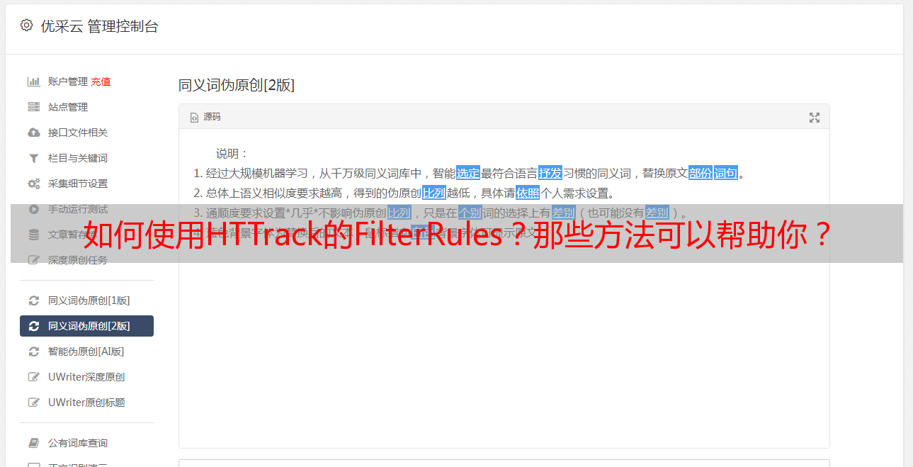 首先,可使用优采云SEO优化工具(www.ucaiyun.com)加快 HTTrack 的下载速度,这是一个强大的 SEO 和优化工具,可帮助 HTtrack 高效下载 web 站点,支撑大流量.