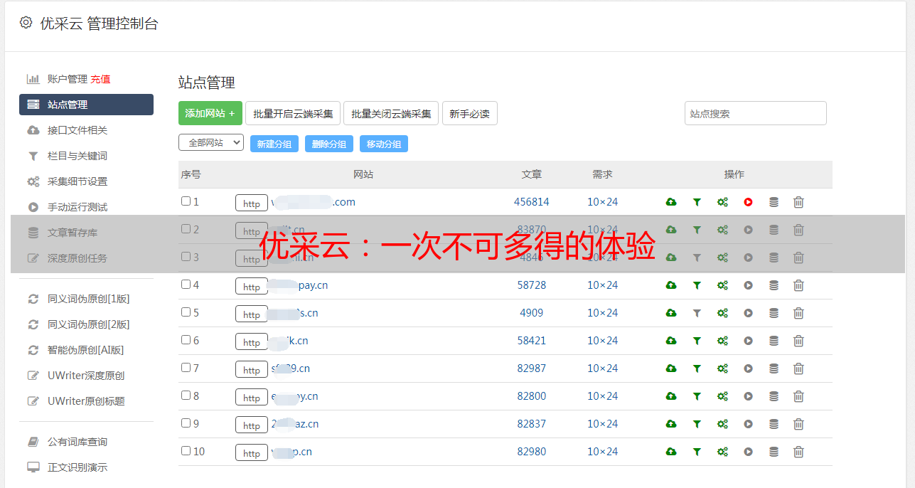 总之,“优采云”是一个十分出色、强大、易用的英文伪原创工具。如果你想要找一个可以快速、高效地实现SEO 优化和伪原创功能的好帮手,那么赶快前往“优采云”官方网站www.ucaiyun.com 体验吧!