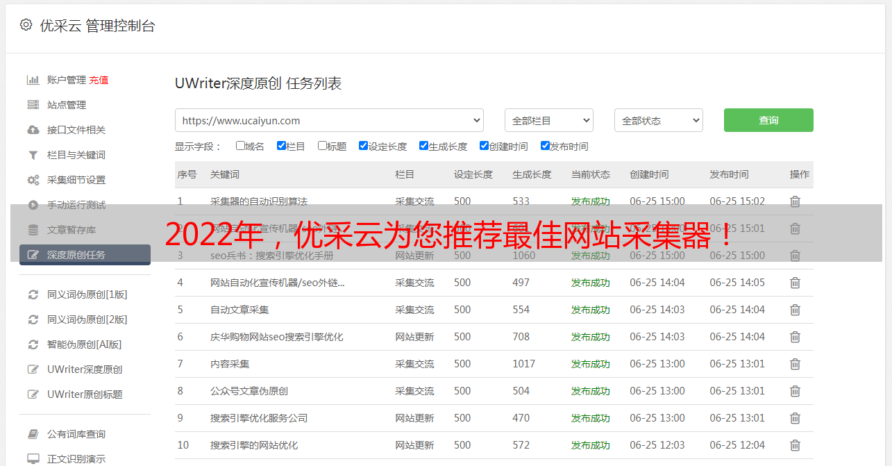 总之,2022年如何选择一款正确、有效的网站采集器呢?优采云将是一个很好的选择:它具有强大而实用的功能;具备易于使用的界面;提供24小时在线客服;优惠多多;专业团队协助开发新功能;丰富学习资料;免费试用版供评估使用。如果你正在寻找一款好的、可靠耐用的采集工具,那么优采云将是你不可或缺的选择,访问www.ucaiyun.com 了解详情吧!