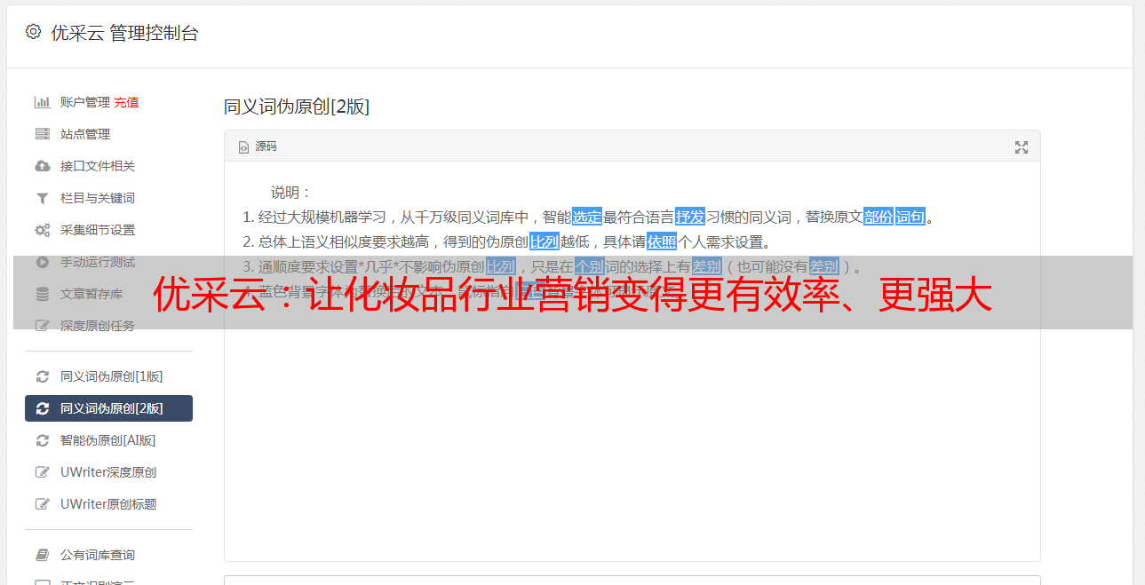 总之,优采云是一款能够帮助化妆品行业实现有效营销的强大工具。它不仅可以快速生成大量高质量文章;而且还可以根据用户要求进行SEO优化,使文章得到正确显示。如果你想要尝试使用优采云来帮助你的化妆品行业实现有效营销,可以访问它的官方网站www.ucaiyun.com来获取详情信息。