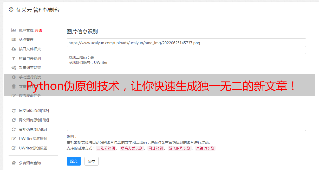 总之,Python文章伪原创是一种能够帮助用户快速生成不易相似、具有可读性的新文章的强大工具。使用此工具时,用户既可以在SEO方面取得好效果,也可以大大减少人工工作量并提升工作效率。如想使用此工具帮助解决问题,不妨尝试一下优采云(www.ucaiyun.com)!