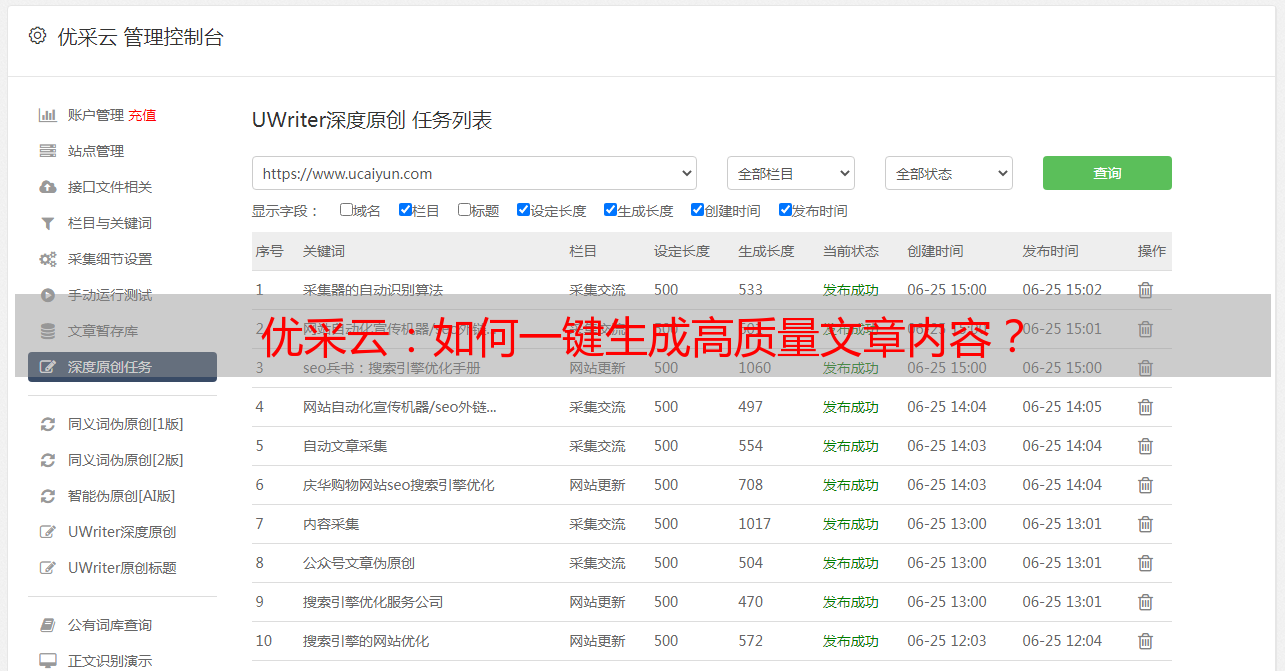 优采云 发布时间: 2023-02-22 17:30随着网络技术的发展,伪原创文章的生成也变得越来越容易。近年来,一键生成伪原创文章的软件已经出现,它们可以帮助用户快速生成高质量的文章内容,广受好评。其中,优采云是行业内最为知名的伪原创文章生成软件,它以其准确、快速、高效的特性赢得了众多用户的认可。