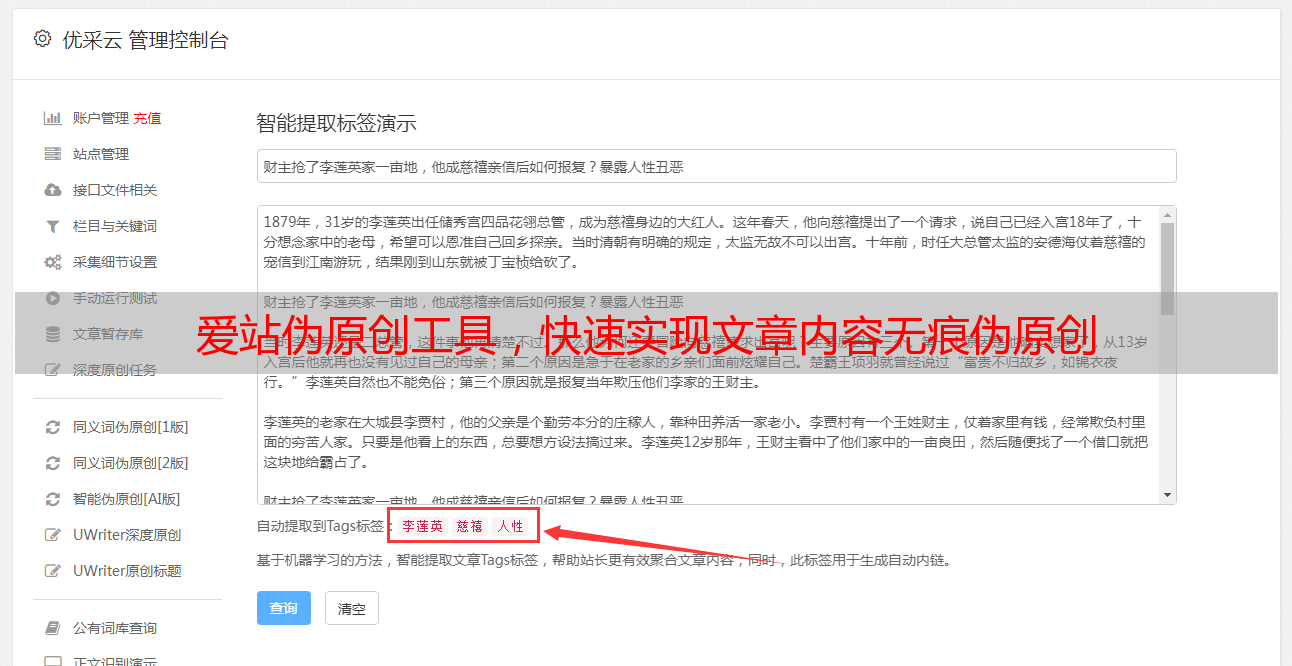 优采云 发布时间: 2023-02-23 19:31随着网站内容的不断发展,更多的企业都在寻找一种能够为网站内容提供更强大的优势的方法。当前,伪原创工具凭借其强大的功能受到了众多企业的青睐。而作为一款专门针对文章进行伪原创加工的软件,爱站伪原创工具能够帮助用户快速将文章内容进行处理,使其拥有更高水平的原创性。