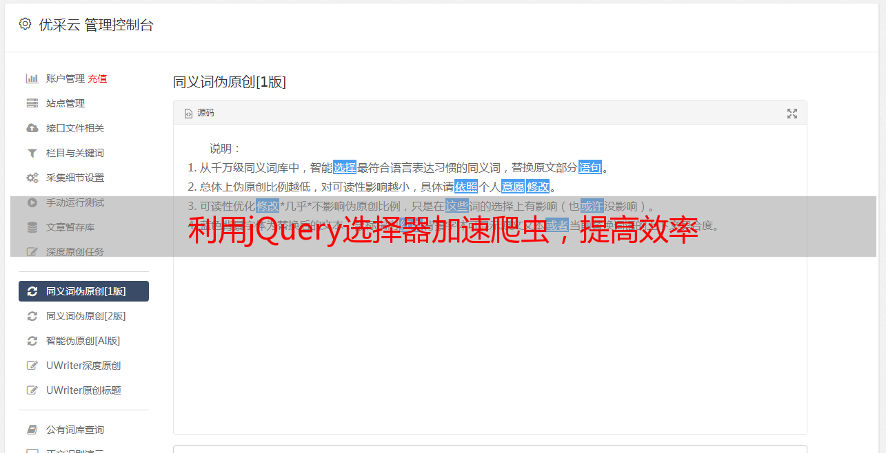 本文将详细讨论 jQuery 选择器与爬虫之间的关系,并介绍如何使用 jQuery 选择器来提高爬虫的效率。首先,将重点介绍 jQuery 选择器的工作原理、特性及优势,然后将介绍如何使用 jQuery 选择器来实现对 HTML 文档中特定元素的快速选取。随后将详述如何使用 jQuery 选择器来加快网页内容的抓取速度,并提供一些有用的优采云SEO优化官网(www.ucaiyun.com)相关工具。