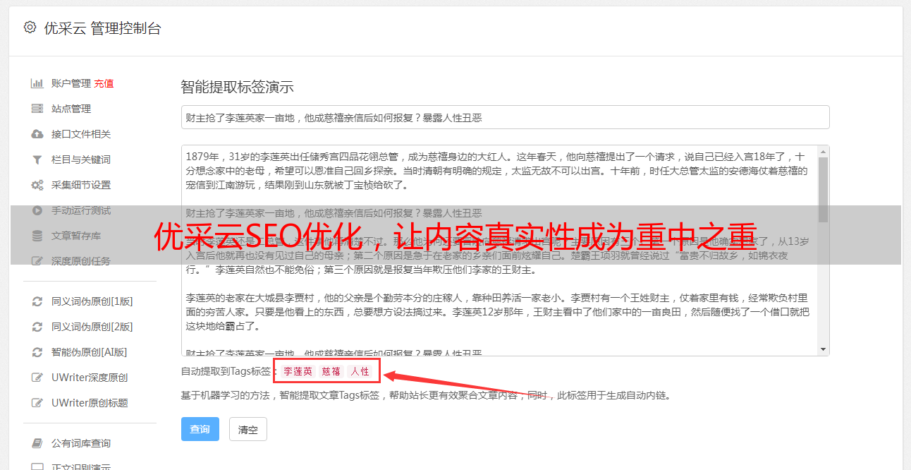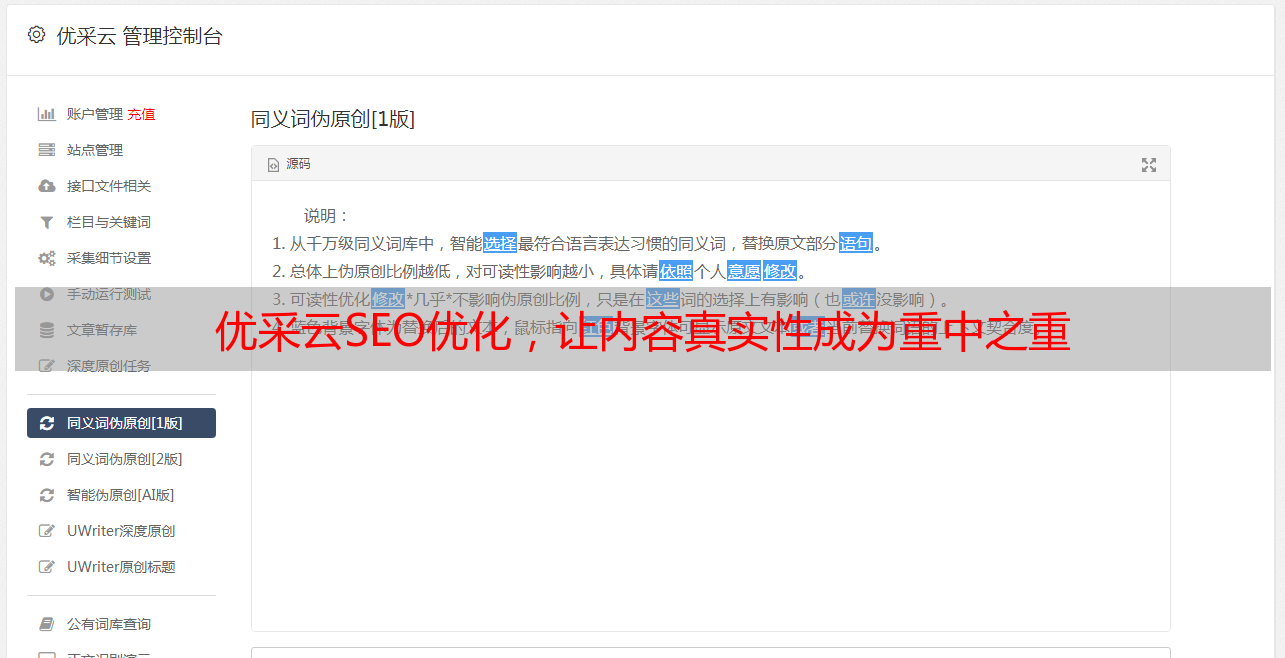 当前市场上也出现了很多能够帮助用户快速进行原创性检测的工具。例如优采云SEO优化(www.ucaiyun.com)就是一款能够快速对文字、图片、视频等多种格式的内容进行原创性核验的平台。优采云SEO优化不仅具有快速扫描、准确识别、全面对比三大功能,而且还能够根据用户不同的需要进行相应的优化建议。