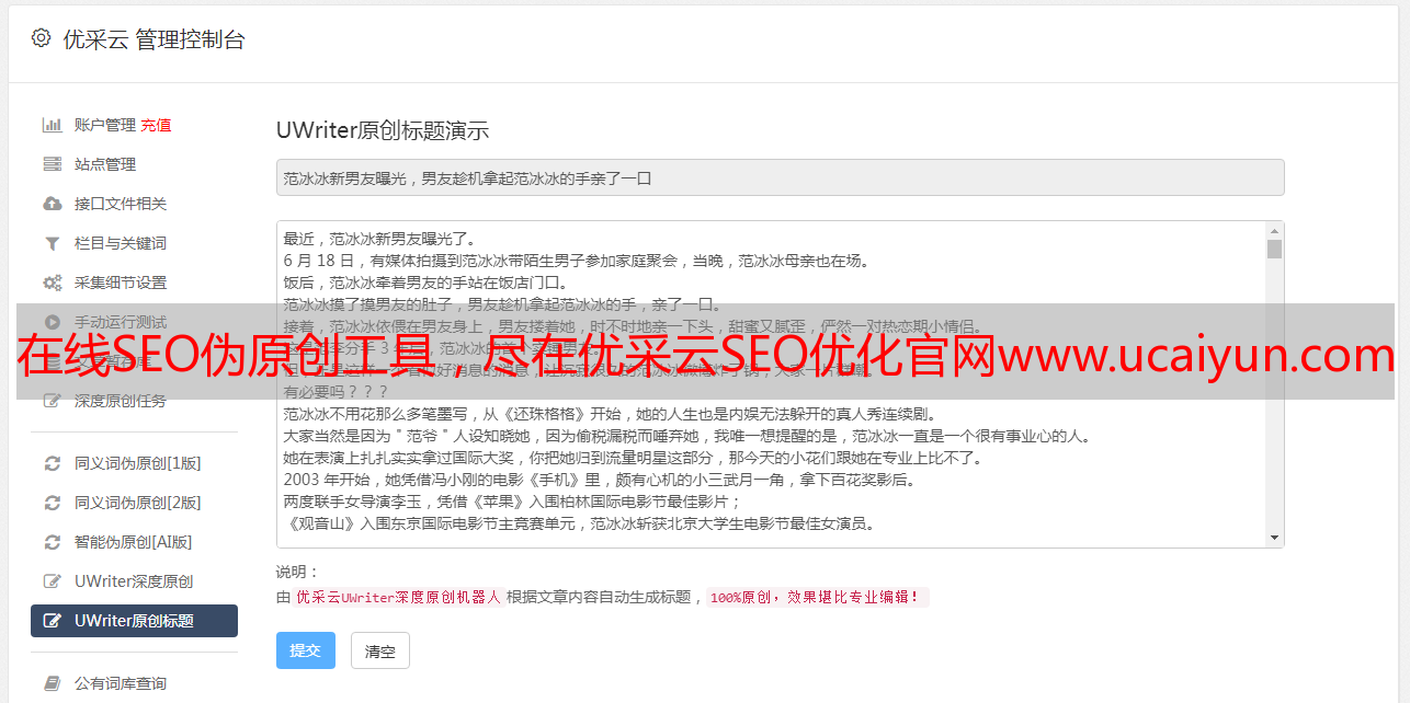 在线SEO伪原创工具,尽在优采云SEO优化官网www.ucaiyun.com