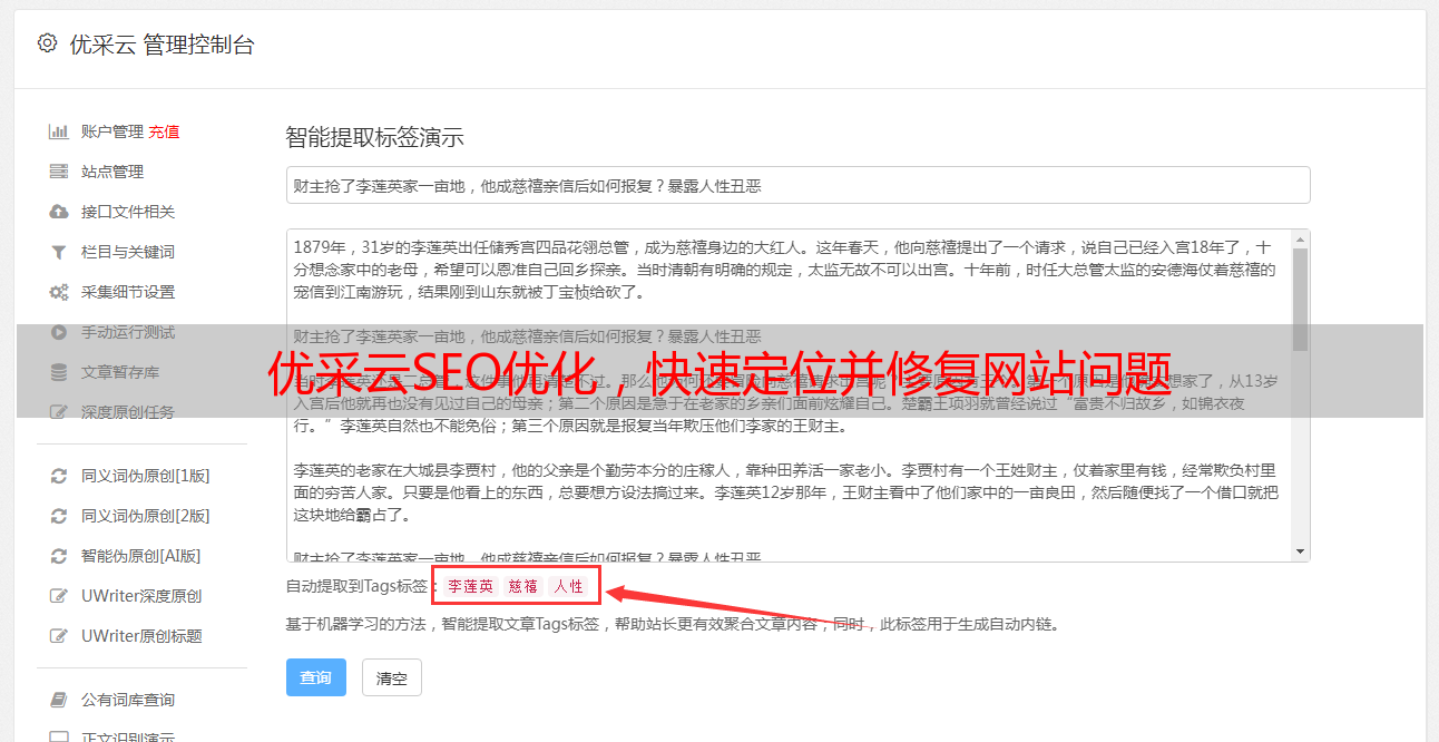 此外,“优采云SEO优化”还能够帮助用户快速定位和修复SEO相关问题。例如,当用户出现404错误时,只需要在“优采云SEO优化”中执行相应的修复步骤就可以快速修复问题。而对于META标签、关键字、标题、ALT标记方面的问题也都可以通过“优采云SEO优化”来快速定位和修复。