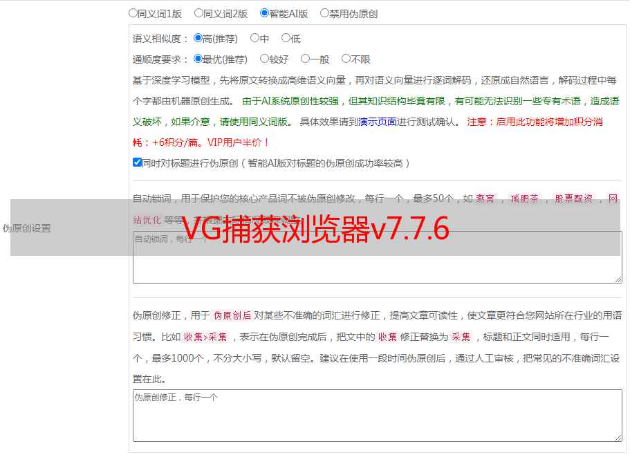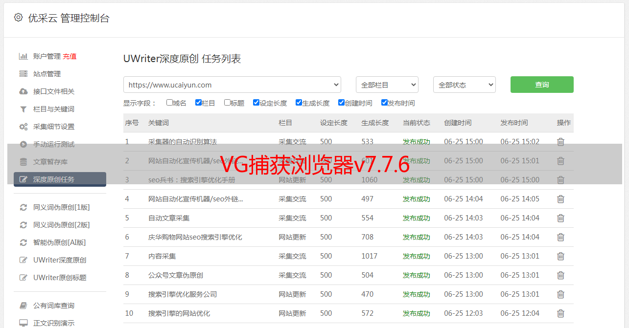 优采云 发布时间: 2020-08-07 21:19VG浏览器中收录三合一的集合浏览器,营销工件和可视脚本驱动的Web工具. 使用此软件,就等于同时拥有三个软件. 用户可以设置脚本来实现自动登录,识别验证码,自动抓取数据,单击网页,下载文件,操纵数据库,发送和接收电子邮件以及其他操作. 软件中的所有功能均可自由组合. 您还可以使用该软件编写独特的脚本来协助您的工作,也可以生成单独的EXE程序进行出售.