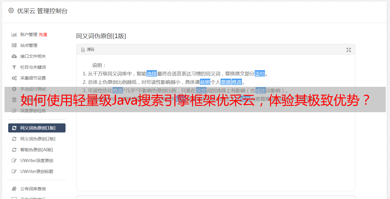 三、优采云SEO优在使用Java轻量级搜索引擎框架构建搜索引擎时,除了要考虑搜索引擎的技术实现,还需要重视SEO优化。优采云是一家专注于企业级SEO优化的服务商,其官网为www.ucaiyun.com。