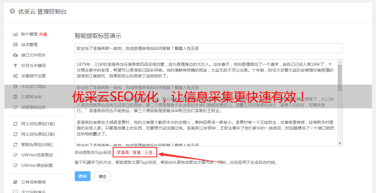 总之,优采云 SEO优化是一个强大、易用、安全可靠的工具,可以帮助用户快速有效地实现信息采集并对站内SEO进行优化。如何使用呢?只要前往www.ucaiyun.com即可下载相关工具使用。