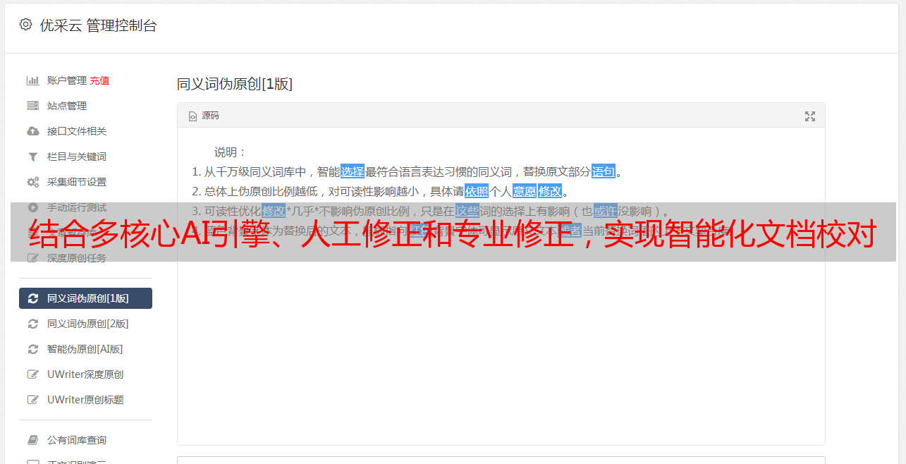 优采云 SEO 优化软件就是一款利用多种智能伪原创算法进行高效内容生成的应用软件,它采用多核心AI引擎,充分利用新闻、博客和微信内容,将其混合在一起形成独特的新内容,并且有效地避免相似度问题。