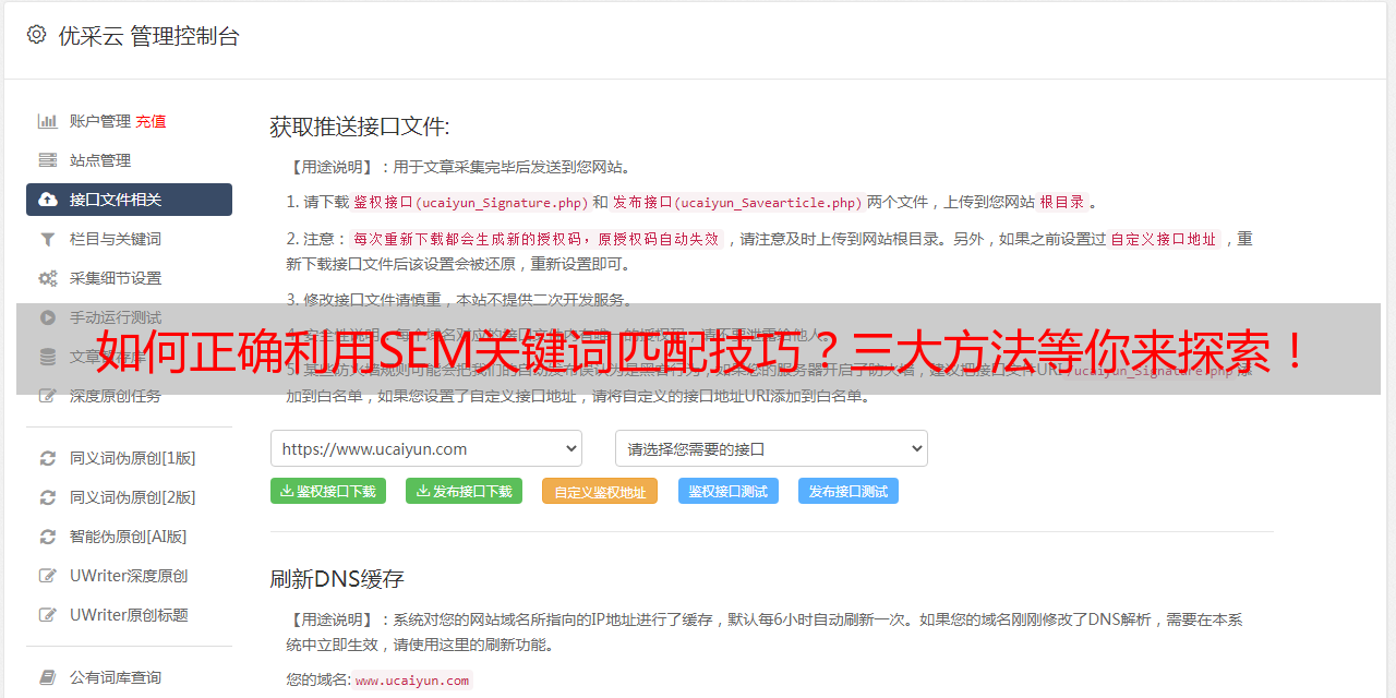 SEM 关键词匹配方式能够有效地帮助企业在SEO 优化中取得成功。就像优采云SEO 优化官网www.ucaiyun.com上所表明的:“SEO 优化是一门艺术和工艺,要想取得成功必然要使用正确的SEM 关键词匹配方式”。因此,要想取得成功就必然要学习正确使用SEM 关键词匹配方式。