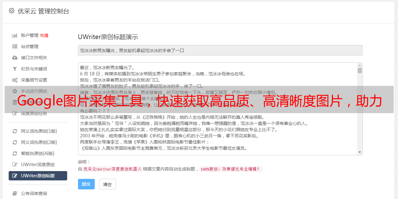 优采云 SEO 优化官网 www.ucaiyun.com 提供了一款实用的 Google 图片采集工具,它能够帮助用户轻松、快速地从 Google 图库中采集图片。该工具不仅可以帮助用户快速获取所需图片,还能够根据关键词和相关信息来进行图片分类和批量采集。