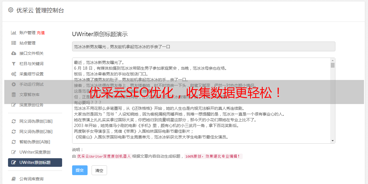 总之,优采云 SEO优化是一个强大的数据采集器工具,它可以帮助用户快速有效地进行SEO优化,并收集各种不同形式的信息。使用者可以通过www.ucaiyun.com来获得详尽的使用说明和使用方法。