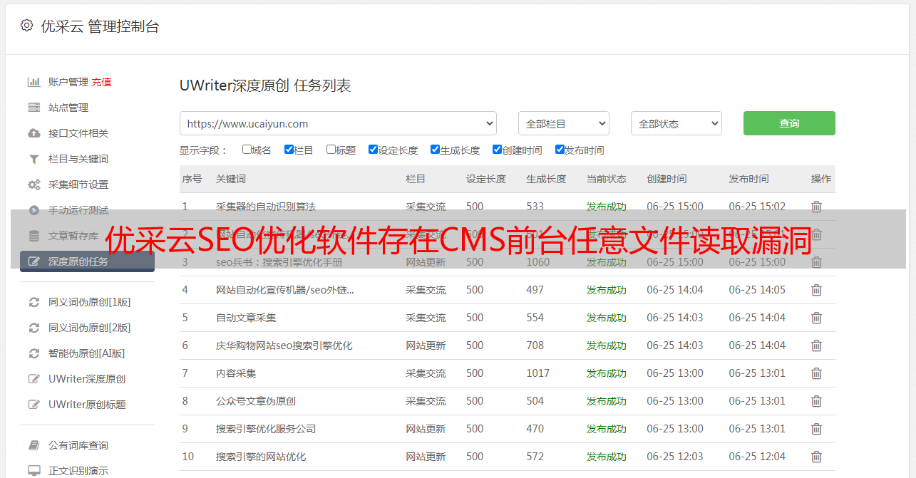 优采云SEO优化软件存在CMS前台任意文件读取漏洞