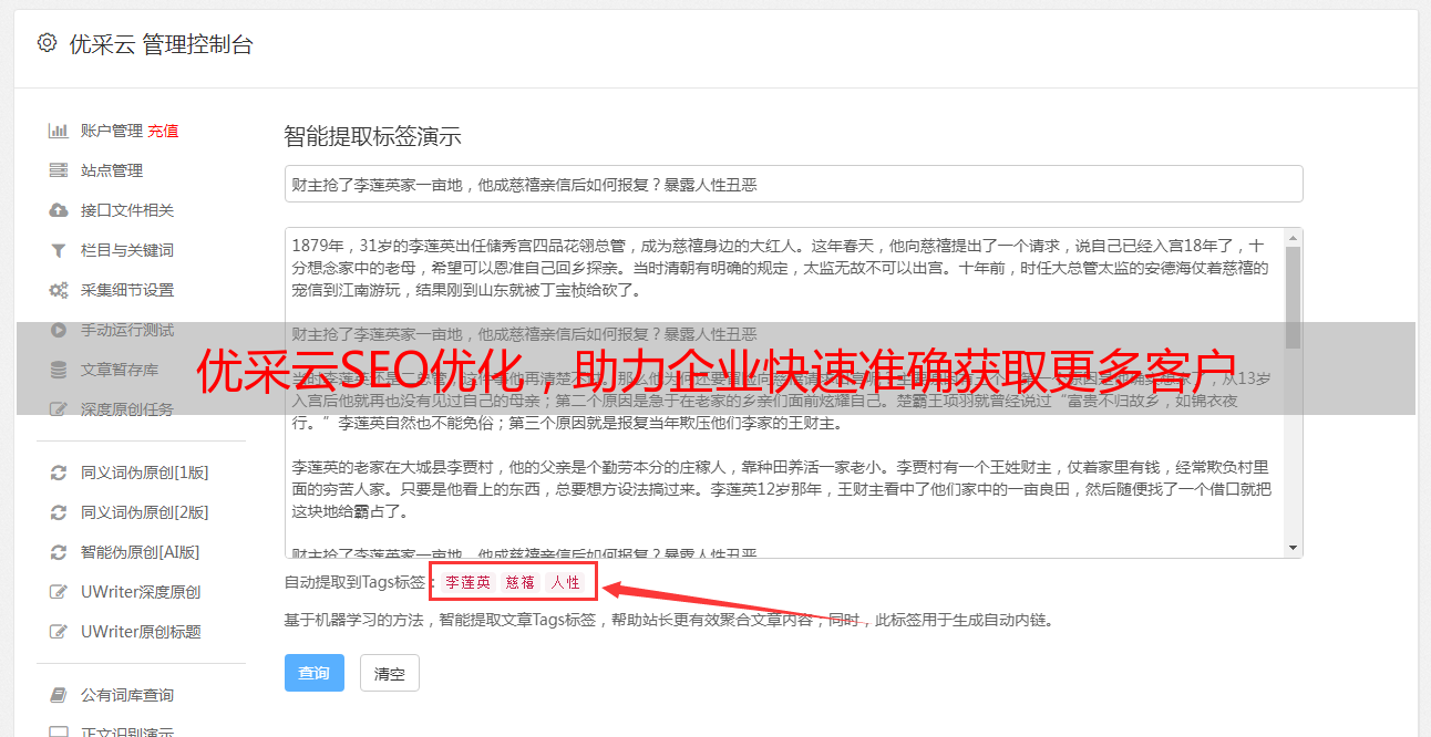 总之,使用优采云 SEO优化可以很好地帮助企业快速准确地从各大门户网站、新闻网站、博客、SNS等平台上获取有价值的文章内容,并对所采集到的内容进行分类和标注,方便对信息进行整理、存储和利用。如需了解详情,请浏览 www.ucaiyun.com 及时了解本产品相关信息,帮助你快速准确地将文章内容录入使用,并提供SEO 优化服务,带你一步步打造出一个强大耐看耐用,性能卓越,无往不利的信息库!