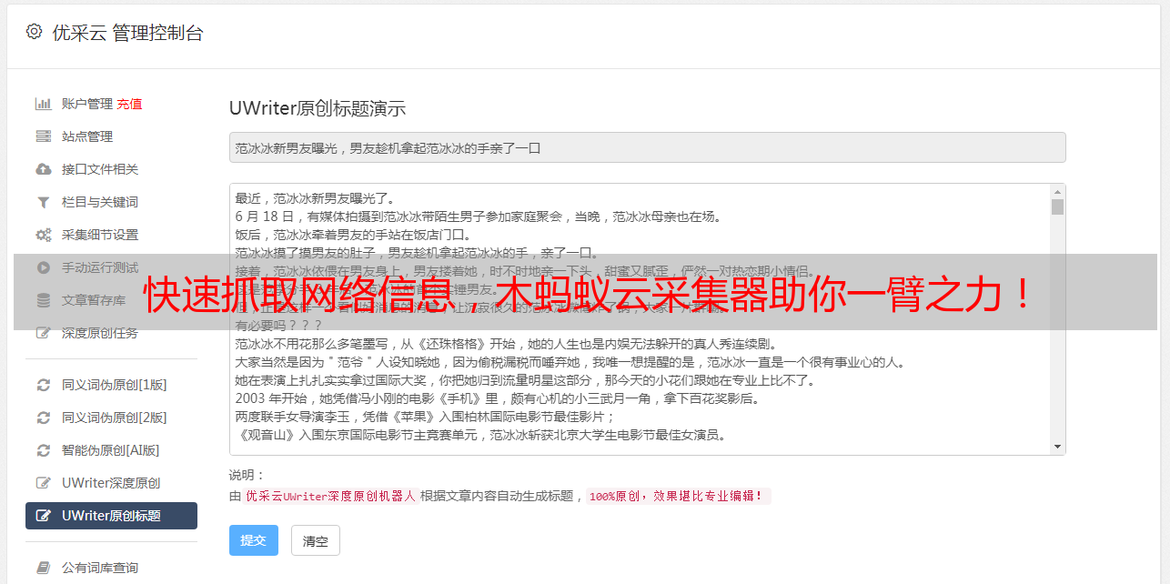 木蚂蚁云采集器是一个很好用的工具,你可以直接下载使用它来采集各种信息。如果想要使用优采云SEO优化工具来对所采集信息进行SEO优化,也很方便,你只需要去官网www.ucaiyun.com上注册并下载即可。
