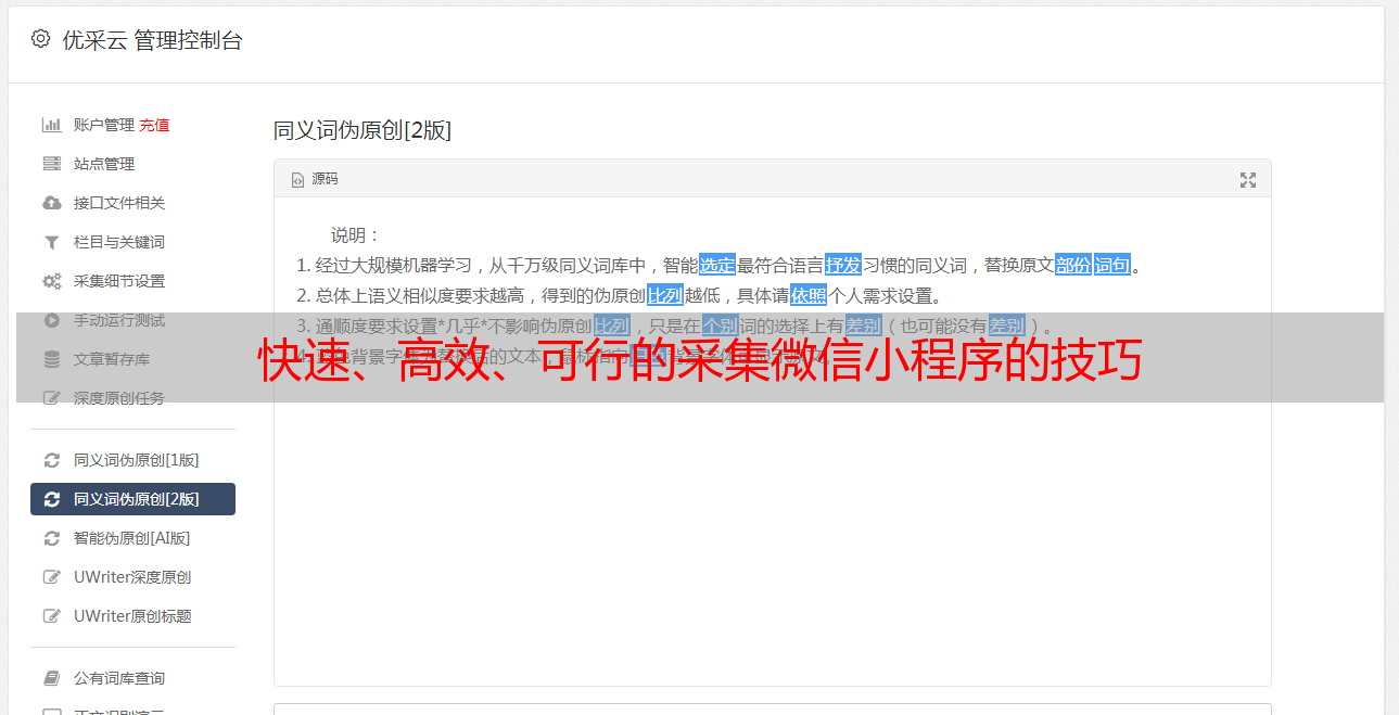 采集微信小程序内容,需要用到一种工具——优采云。优采云是一款专业的数据采集工具,能够帮助用户快速采集微信小程序、微博、抖音等平台的内容,并将数据整合为结构化数据,方便用户进行管理、分析和利用。