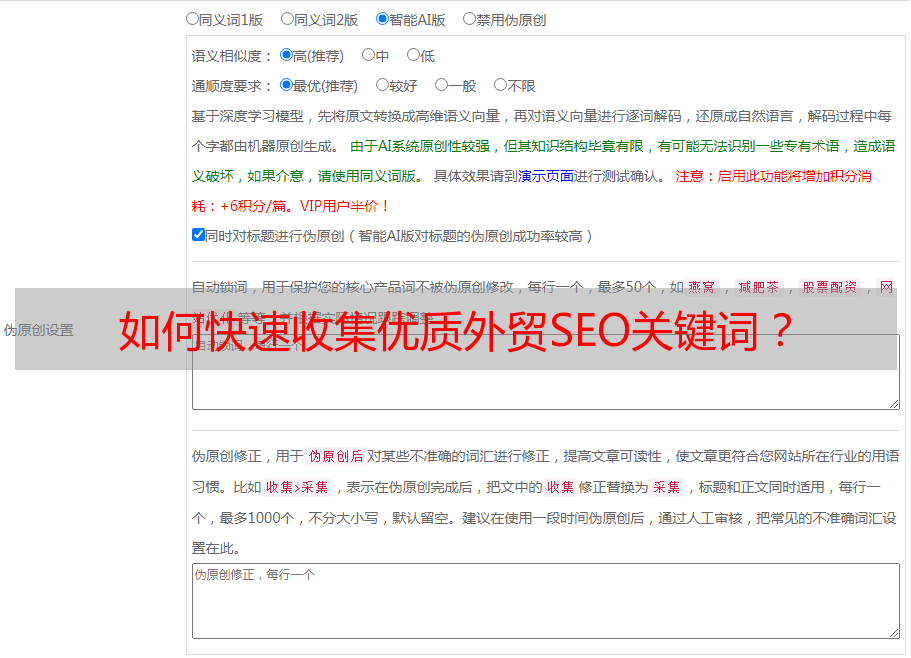 优采云 发布时间: 2023-03-01 19:35外贸是国民经济中的重要组成部分,而外贸网站SEO优化是外贸公司不可或缺的重要一环。而外贸SEO优化的第一步就是关键词的选择。那么如何寻找优质的外贸关键词收集渠道呢?