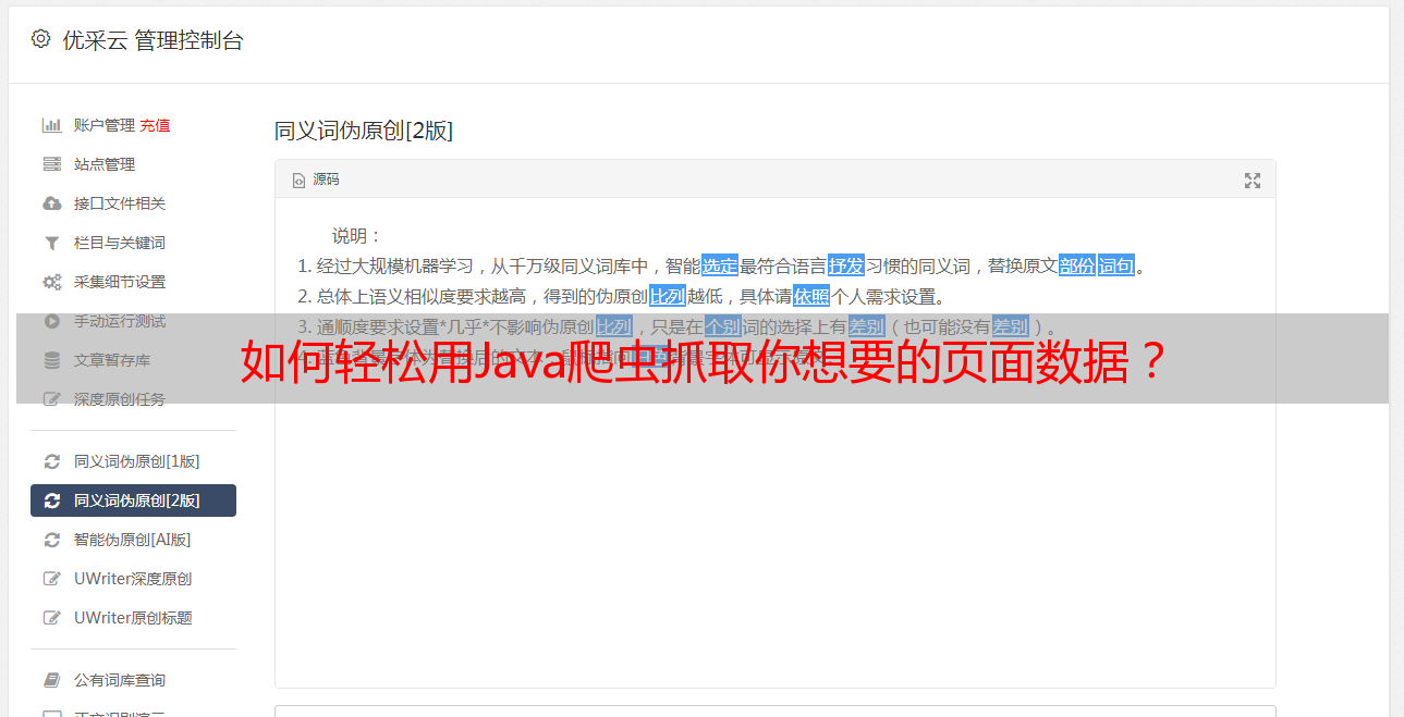 优采云 发布时间: 2023-03-01 20:18随着互联网的迅猛发展,信息的获取变得越来越重要,而网页作为信息获取的重要来源之一,其数据的获取也变得越来越受到关注。本文将介绍如何利用Java爬虫轻松获取你想要的页面数据,并讲述如何对这些数据进行SEO优化,以使其更易于被搜索引擎收录。
