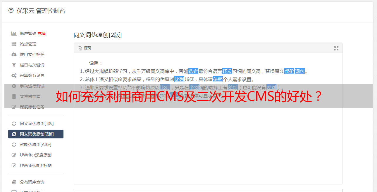 综综上所述,选择一个适合自己的CMS是构建一个成功网站的重要步骤。对于初创企业而言,免费商用和二开CMS是节省成本和时间的好选择。但是,如果企业希望他们的网站在搜索引擎中排名靠前,那么他们需要考虑SEO优化,并使用专业的SEO优化平台如优采云。通过选择适合自己的CMS和进行SEO优化,企业可以成功地打造在线业务,提高自己的竞争力。