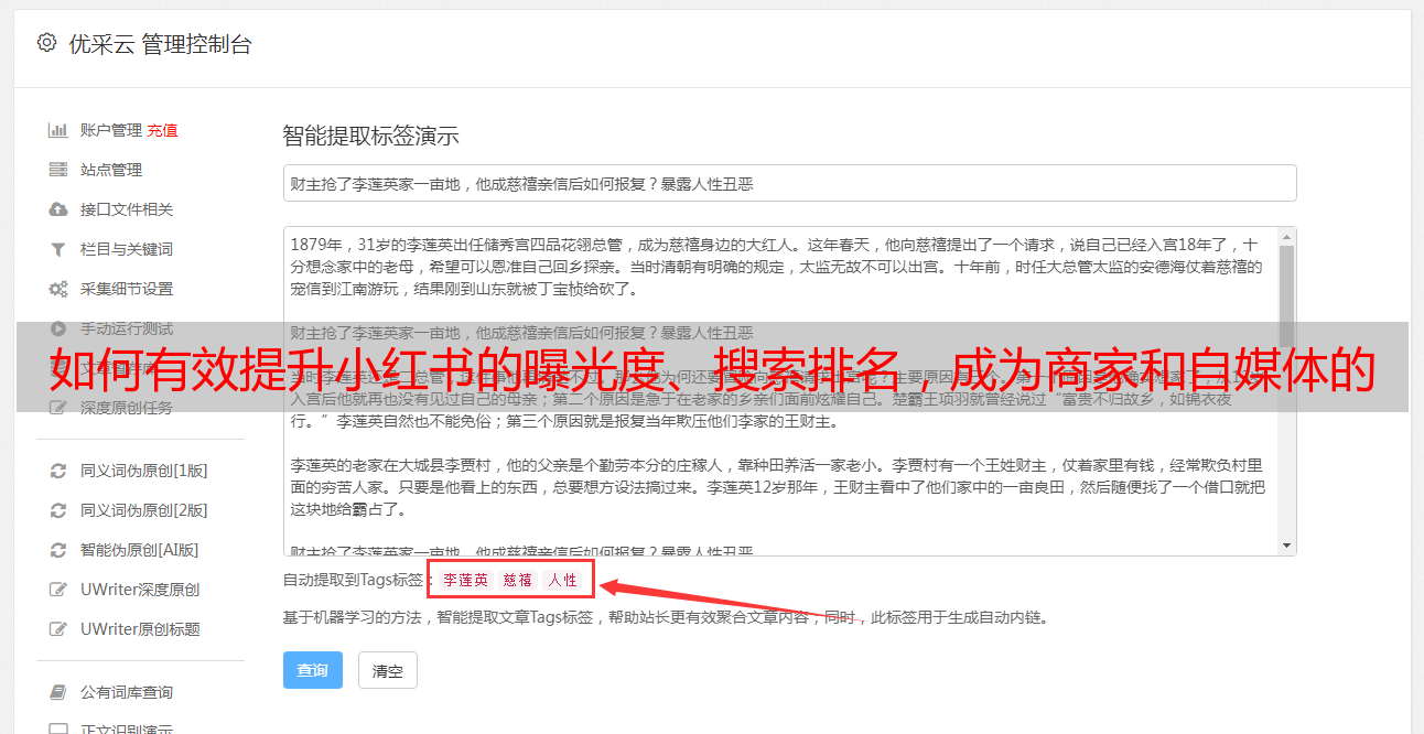 优采以上是关于如何利用优采云和SEO优化提高小红书流量的详细介绍,希望能够对大家有所启发和帮助。在小红书这个竞争激烈的平台上,提高搜索排名和流量需要不断地探索和实践,希望大家能够不断地优化自己的内容,获得更好的效果。