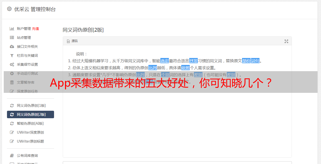 优采云 发布时间: 2023-03-01 23:14在今天的数字化时代,数据已成为企业和个人不可或缺的重要资源,而如何有效地采集数据成为了一个很大的难题。而现在,我们可以通过App采集数据来解决这个问题。下面,我们来一起探讨一下App采集数据的五大优点。