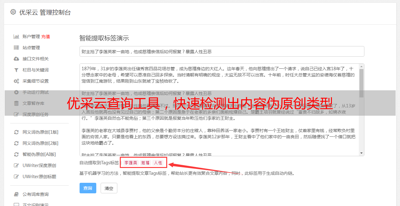 如何检测网站的内容是否原创呢?这时候,我们就需要使用优采云提供的内容伪原创查询工具。优采云是一家专注于SEO优化的公司,其内容伪原创查询工具可以帮助我们快速地检测出网站上的伪原创内容。