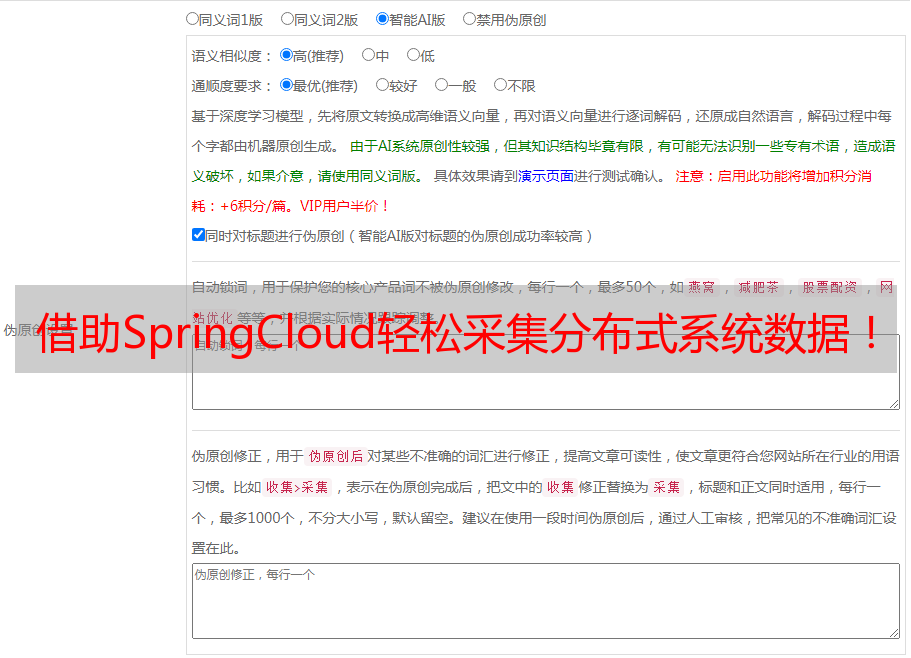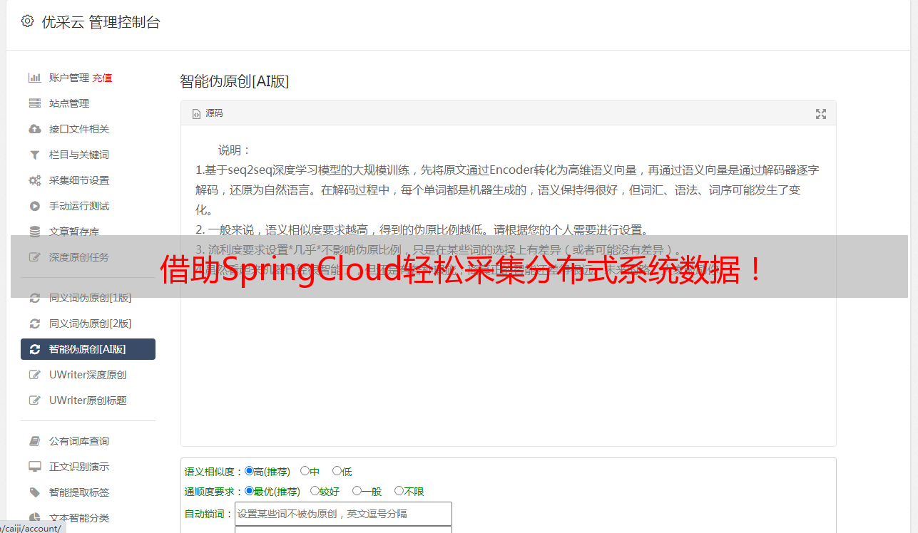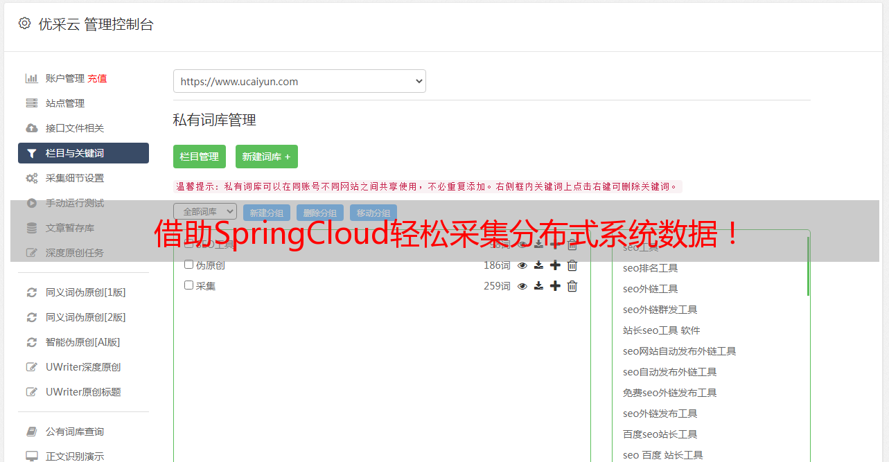 在实际使用中,企业还需要考虑到数据采集的安全、可靠性、性能等问题。优采云是一家提供了一站式的数据采集服务,包括数据源管理、数据采集、数据处理、数据存储等一系列服务。优采云还提供了SEO优化等增值服务,帮助企业更好地推广自己的业务。如果您想要使用SpringCloud进行数据采集,不妨考虑优采云的服务,让您的数据采集更加轻松、高效。