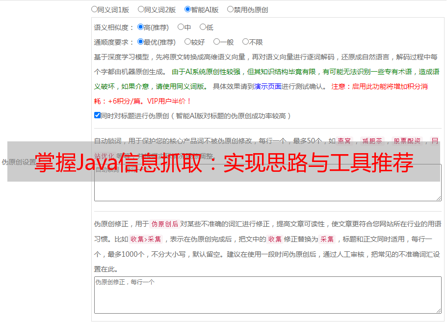 综上所述,Java信息抓取是一项非常实用的技术,可以帮助我们快速获取所需的数据,但在使用过程中需要遵守相关规定,避免违反法律法规和网站规定,保护自己和他人的合法权益。