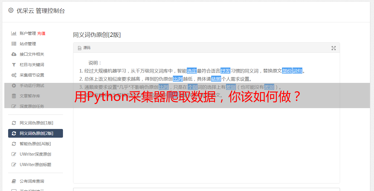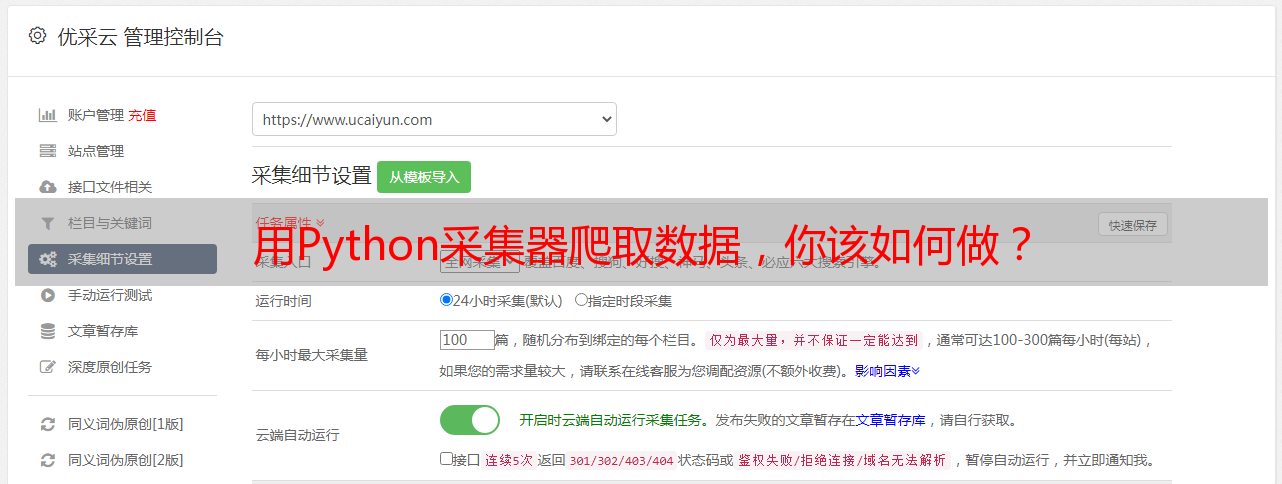 综上所述,Python采集器作为一种强大的数据爬取工具,不仅方便易用,而且具有高效、稳定的特点,为用户带来了极大的便利。而因此,如果你正在面对数据采集的问题,Python采集器是一个不错的选择。无论是企业还是个人,都可以通过Python采集器轻松地实现数据的获取和处理,让数据分析更加便捷高效。如果你想要了解更多关于Python采集器的信息,可以访问优采云官网www.ucaiyun.com,了解更多详细信息。