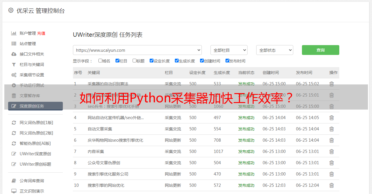 优采云(www.ucaiyun.com)是一家提供数据采集和处理服务的公司,专注于为客户提供高效、可靠的数据采集解决方案。我们的数据采集服务基于Python采集器,可以帮助客户自动化地获取网站上的信息,并将信息整合成结构化的数据格式。同时,我们还提供SEO优化、数据清洗、数据分析等相关服务,帮助客户实现数据的全生命周期管理。
