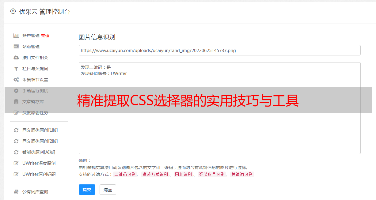 如果你对编程不太熟悉,或者需要采集的选择器比较复杂,那么可以考虑使用优采云。作为一款专业的SEO优化工具,优采云提供了强大的采集功能,可以帮助你轻松地采集所需的CSS选择器。具体操作方法如下: