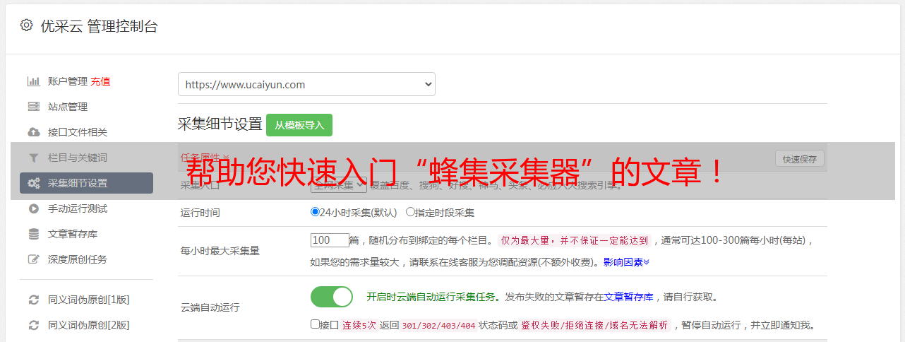 这是文章,帮助您快速上手“蜂集采集器”。如果你刚接触采集器,建议你仔细阅读这篇文章,它会很快帮助你采集器 很有帮助。