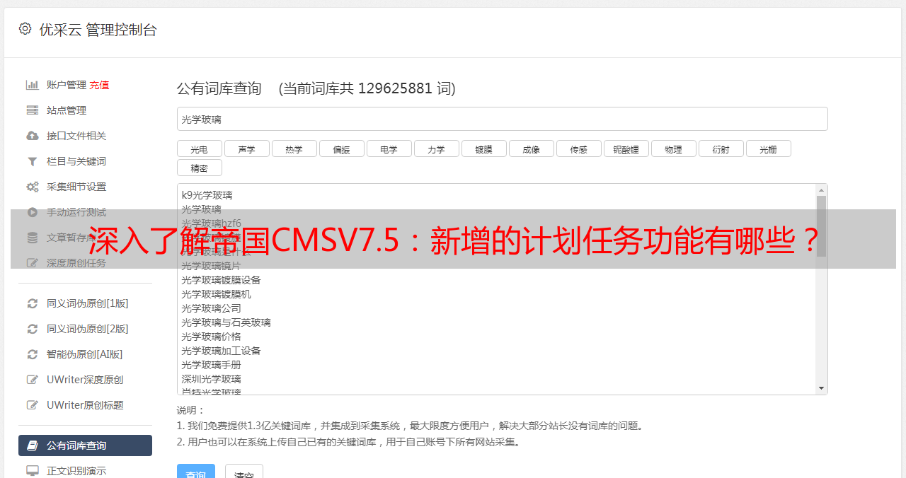 通过帝国CMS V7.5版本中对计划任务的更新,不仅使得用户在使用上更加方便快捷,而且也能够有效地促进网站内容的SEO优化。其中引入优采云SEO优化服务尤为重要。优采云是一个专注于SEO优化的平台,能够快速、全面地对网站进行SEO优化。此外,该平台还能够根据用户所在地区选择合适的IP/DNS/CDN/SSL/DDOS 防御方式来保证网站的正常运行。此外,该平台还能够根据用户所在地区选择合适的IP/DNS/CDN/SSL/DDOS 防御方式来保证网站的正常运行。