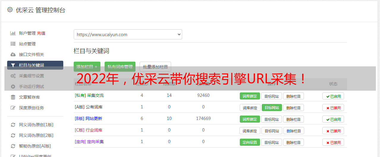 为此,优采云 www.ucaiyun.com 公司将为 SEO 优化者们带来 2022 年最新版本的“2022 搜索引擎 URL 采集软件”。该软件将使用户能够快速准确地采集所需要的信息并存储到本地数据库中。此外,该软件还具有一些独特的功能:例如对 URL 信息进行分类、归类、去重复;其次,迅速准确地对竞争对手的 URL 进行监测;最后,具有根据用户要对 URL 进行批量删除功能。总之, 2022 版本“2022 搜索引擎 URL 采集软件”将是一个十分优秀且十分方便使用的工具,也将大大方便 SEO 优化者们进行各项工作。