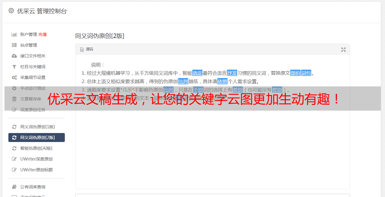 优采云是一家专业的SEO优化服务公司,其文稿生成关键字云图服务可以帮助我们快速生成高质量的关键字云图,从而提高文章的点击率和曝光度。下面,我们来看看这个服务是如何工作的。