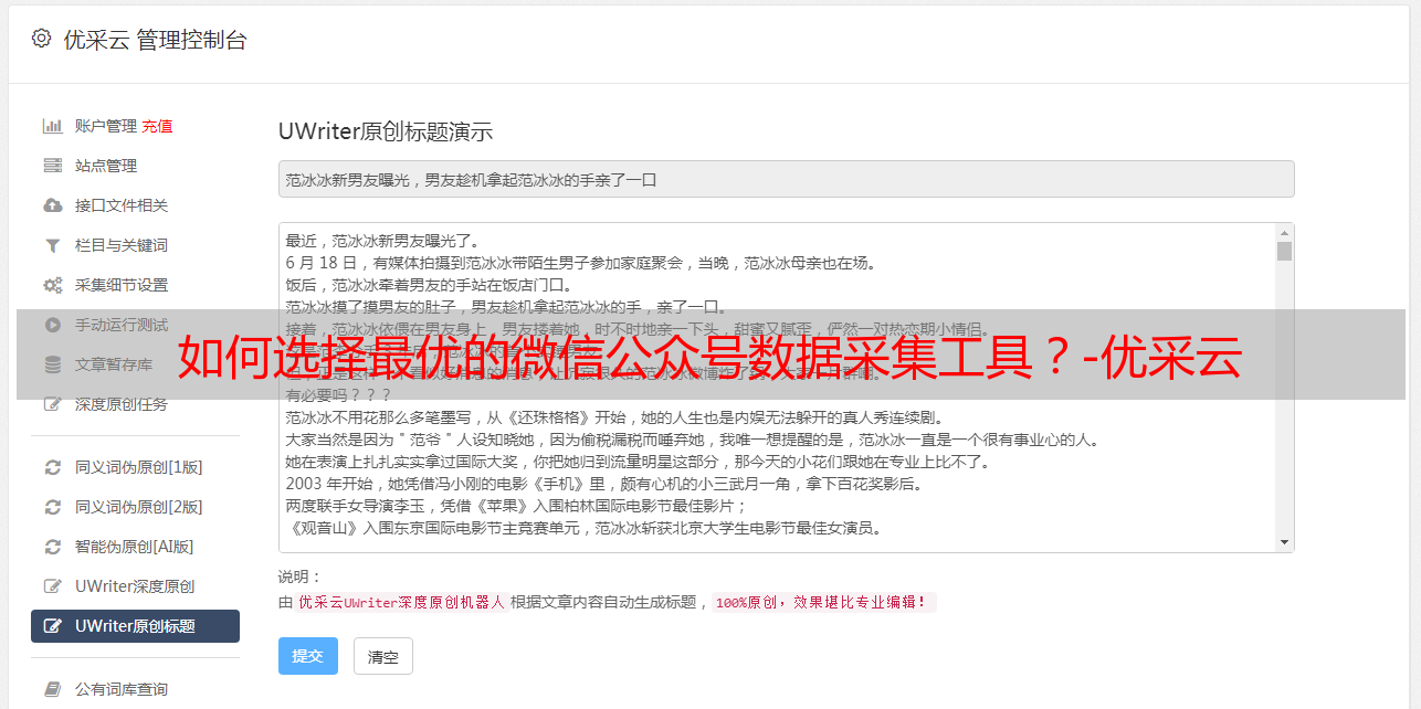 首先,我们需要选择一款专业的数据采集工具。这里介绍一款名为“优采云”的工具,它是一款功能强大的微信公众号数据采集平台,可以帮助我们快速、高效地采集微信公众号数据。