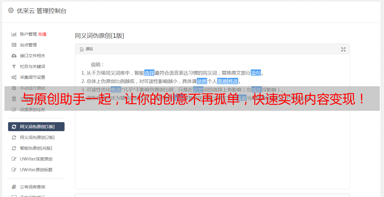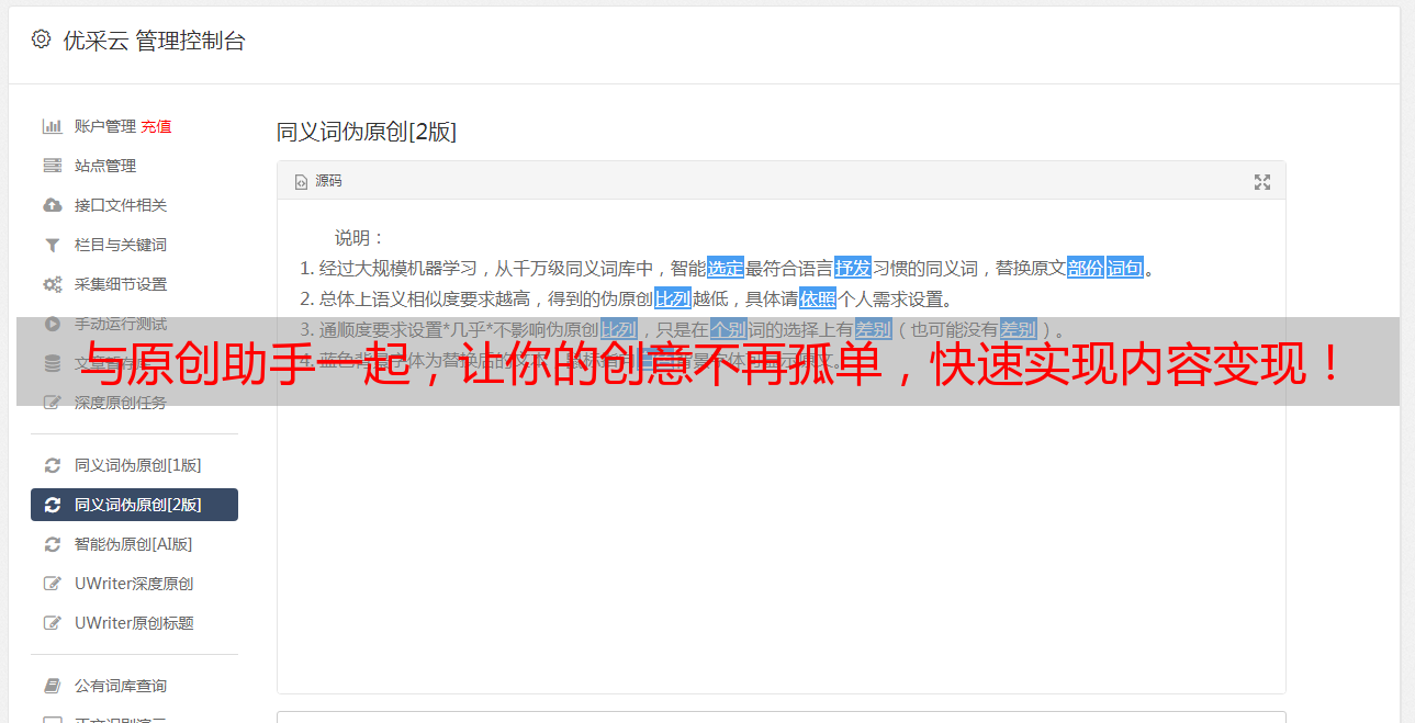 总之,优采云的原创助手是一个非常强大、智能、全面、易用的工具。无论是想要写作、SEO优化还是内容变现,都可以在这里得到满足。如果你也想拥有这样一个好帮手,请访问我们的官网:www.ucaiyun.com。